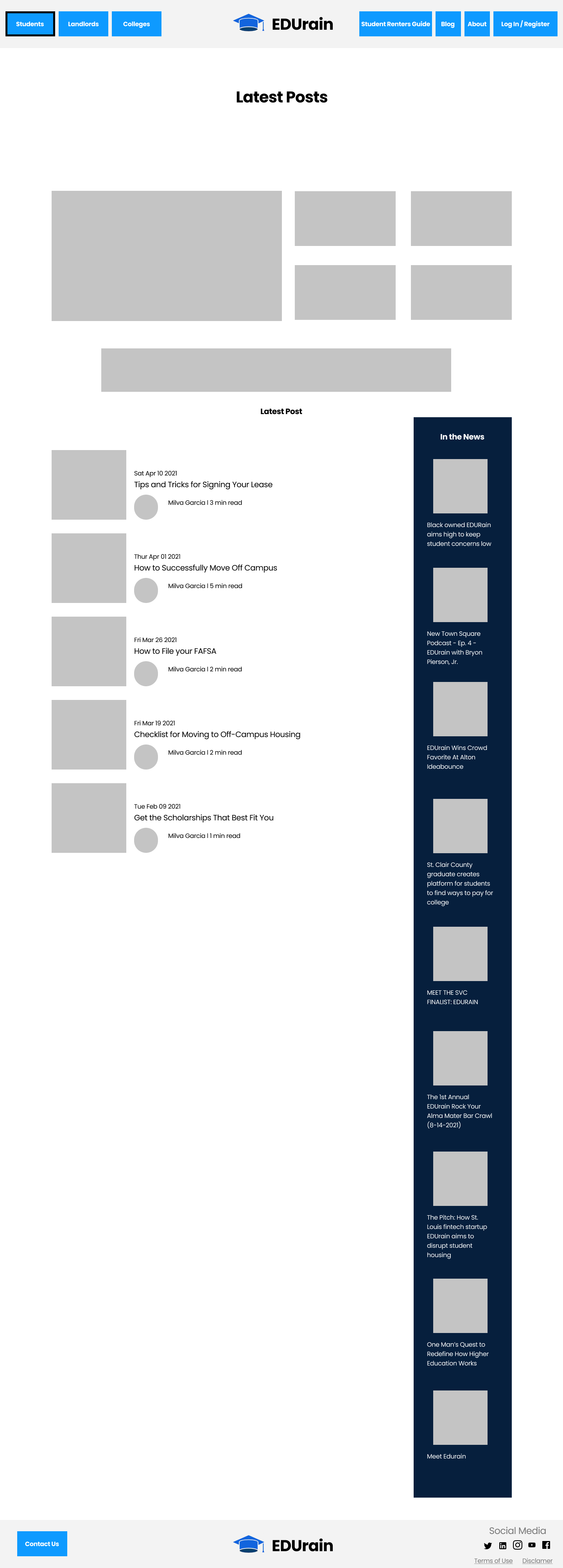 As a team we broke down on creating our wireframes. I worked on creating both Low-Fi and Hi Fi-Wireframes for the About Us page, Student Renters Guide and the Blog section. For the redesigned frames our team made sure to stick with EDUrain’s layout because of the fact that this worked for our users.